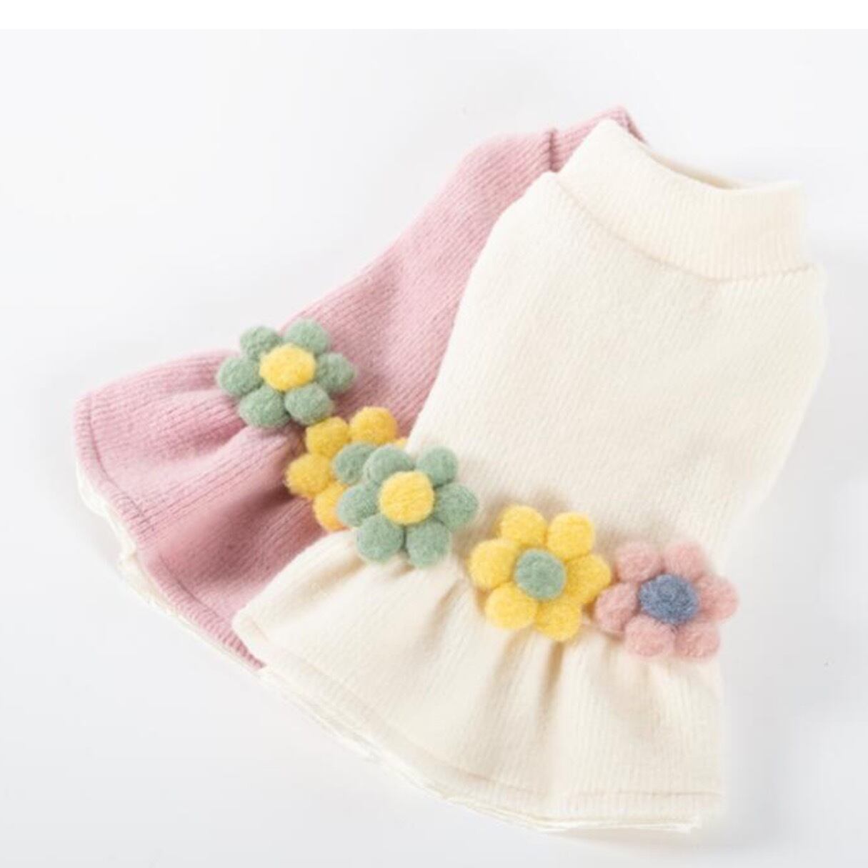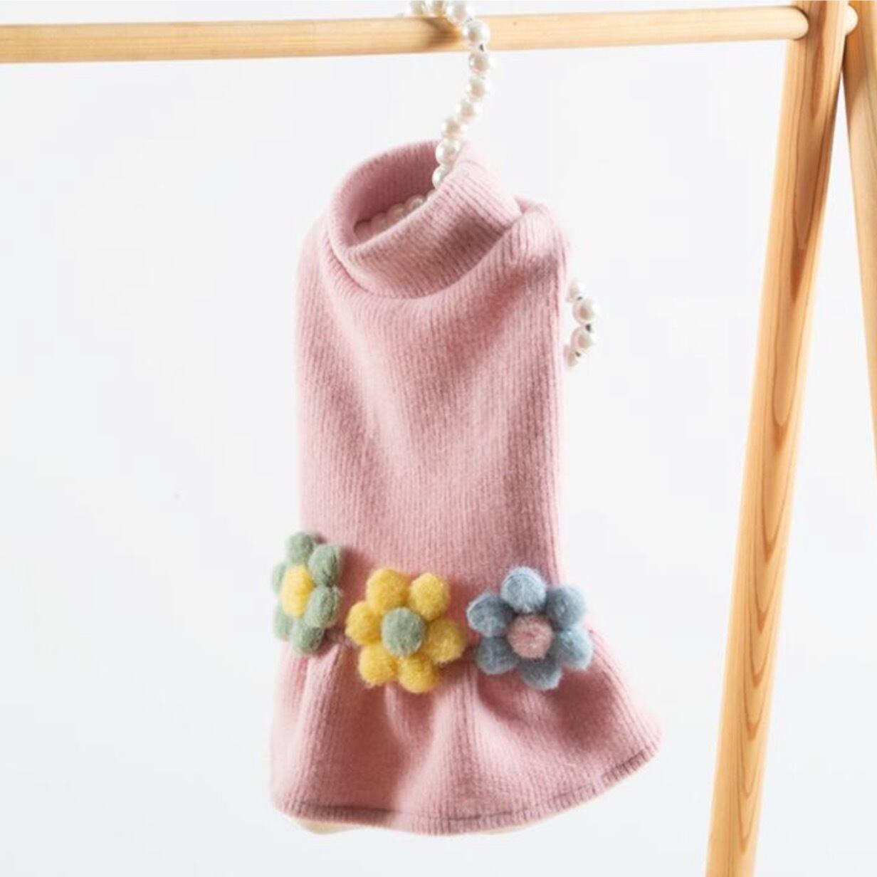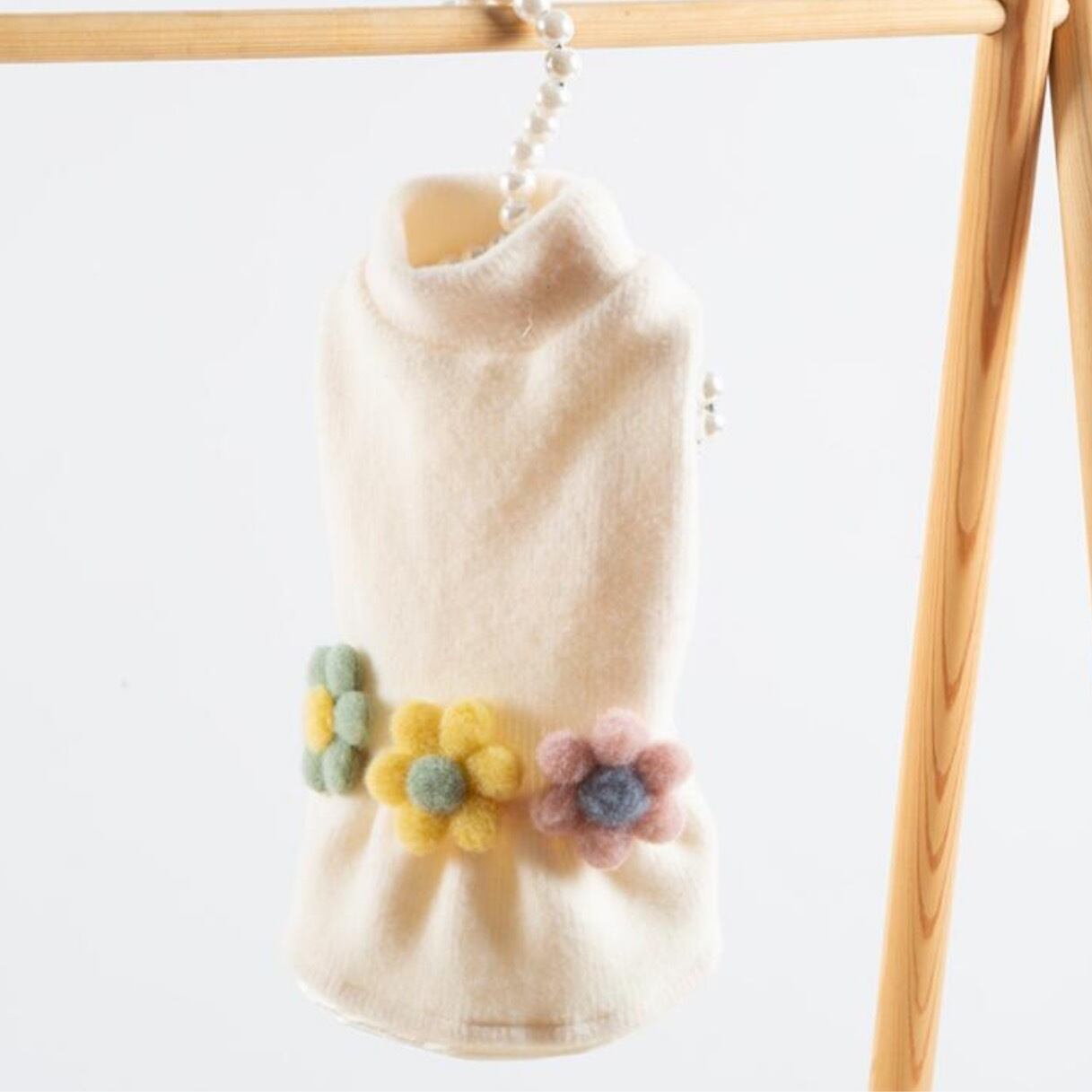 起毛ニットのハイネックのシンプルなデザインにかわいいお花モチーフが付いたとてもキュートなワンピース。