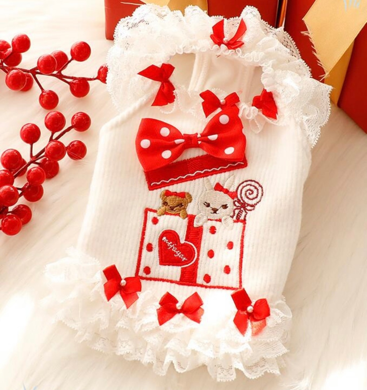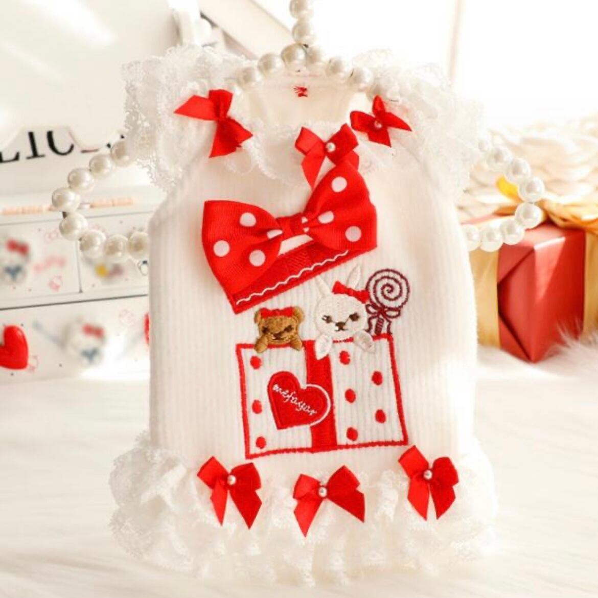 可愛らしいクマとウサギのプレゼントBOXアップリケが特徴です。ふわふわの裏起毛素材とさらに裏側にフリースを合わせ、寒い冬の日も暖かく過ごせます。