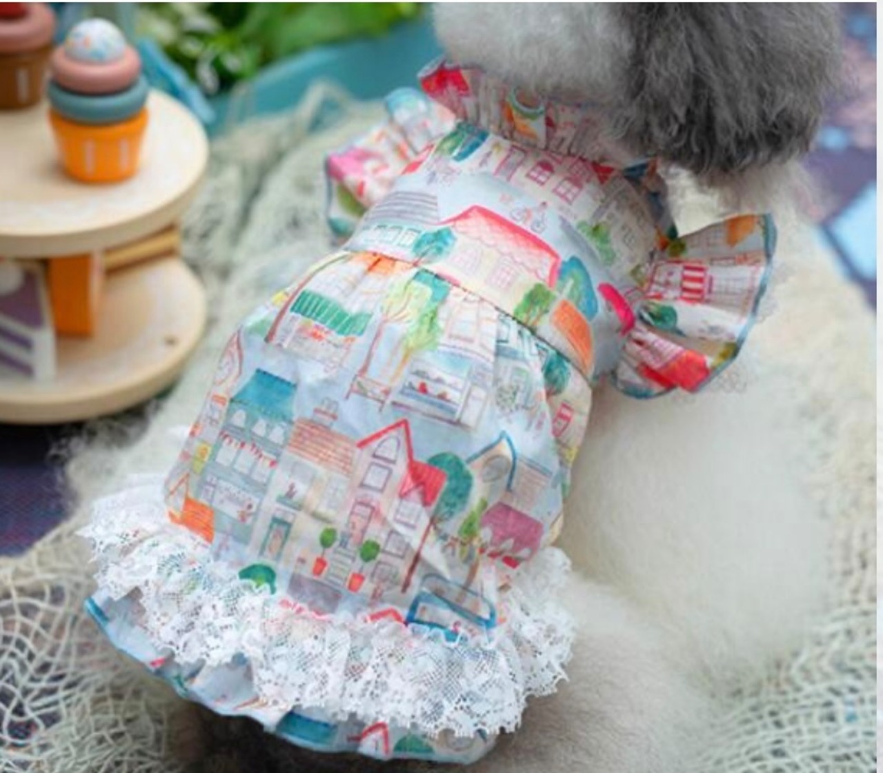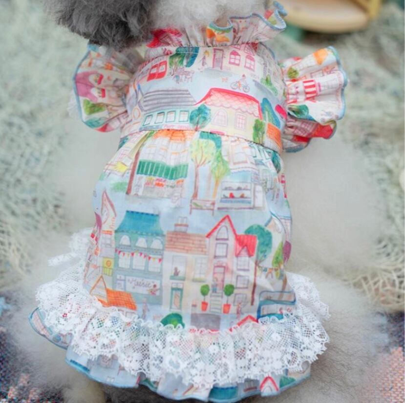 薄手の素材にやさしい水彩画タッチの街の柄です。
